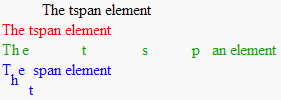 < tspan>< /tspan>是 SVG 文字裡頭重要的元素,因為它可以塑造出千變萬化的文字表現方式,而看< tspan>的字面,其實可以把它想像成 HTML 裏頭的span也無妨,也可以想像成在< text>裏頭的一個一個文字群組。< tspan>和< text>具有的屬性值幾乎一模一樣,也是 x、y、dx、dy、rotate、textLength。