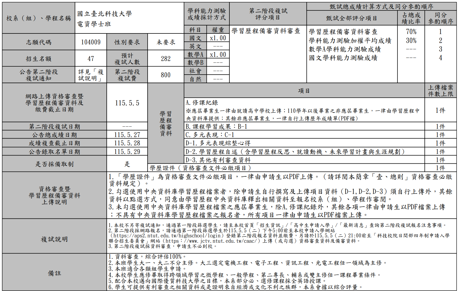 115學年度 四技申請入學聯合招生簡章分則